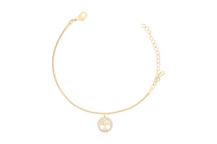 PULSEIRA BANHADA EM OURO, ELO RABO DE RATO 1,20mm, 17cm COMPRIMENTO, EXTENSOR 5cm E ÁRVORE DA VIDA 10mm DIÂMETRO