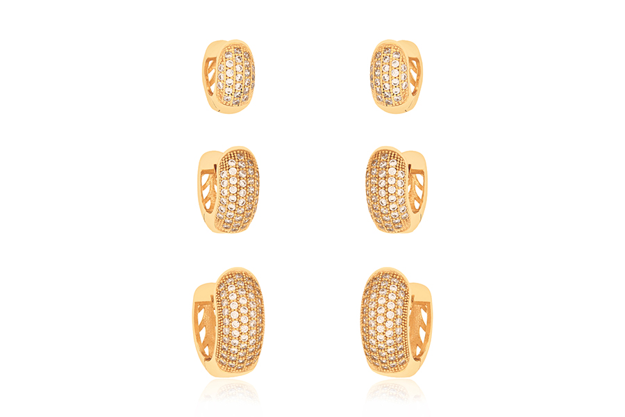 CONJUNTO BANHADO EM OURO, TRIO DE BRINCOS ARGOLINHAS BRANCAS COM 54 ZIRCÔNIAS 17mm, 40 ZIRCÔNIAS 15mm E 25 ZIRCÔNIAS 12mm