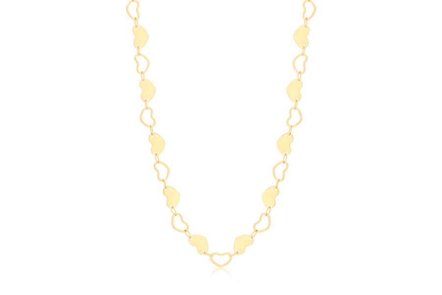 GARGANTILHA BANHADA EM OURO, PINGENTE MÃE, CORAÇÃO 11mm LARGURA, PÉROLAS BARROCAS 5mm LARGURA, 45cm COMPRIMENTO, EXTENSOR 5cm