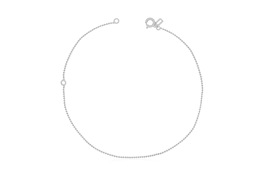 TORNOZELEIRA BANHADA EM RÓDIO BRANCO, CORRENTE ELO ESFERAS 1mm, 22cm COMPRIMENTO, EXTENSOR 5cm COMPRIMENTO E PESO 1g
